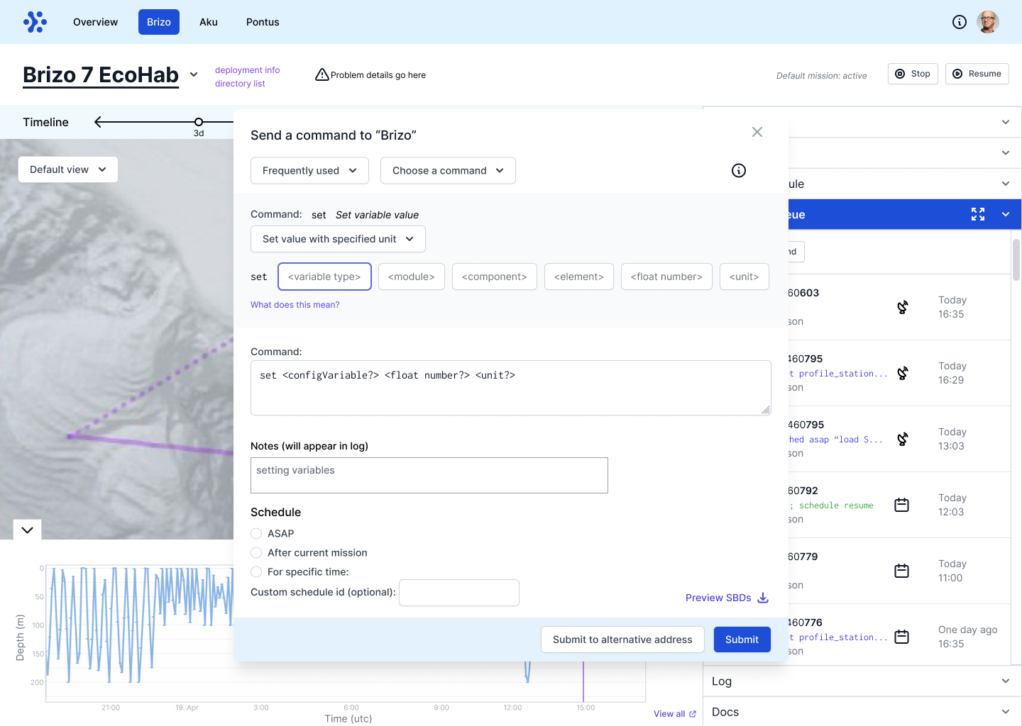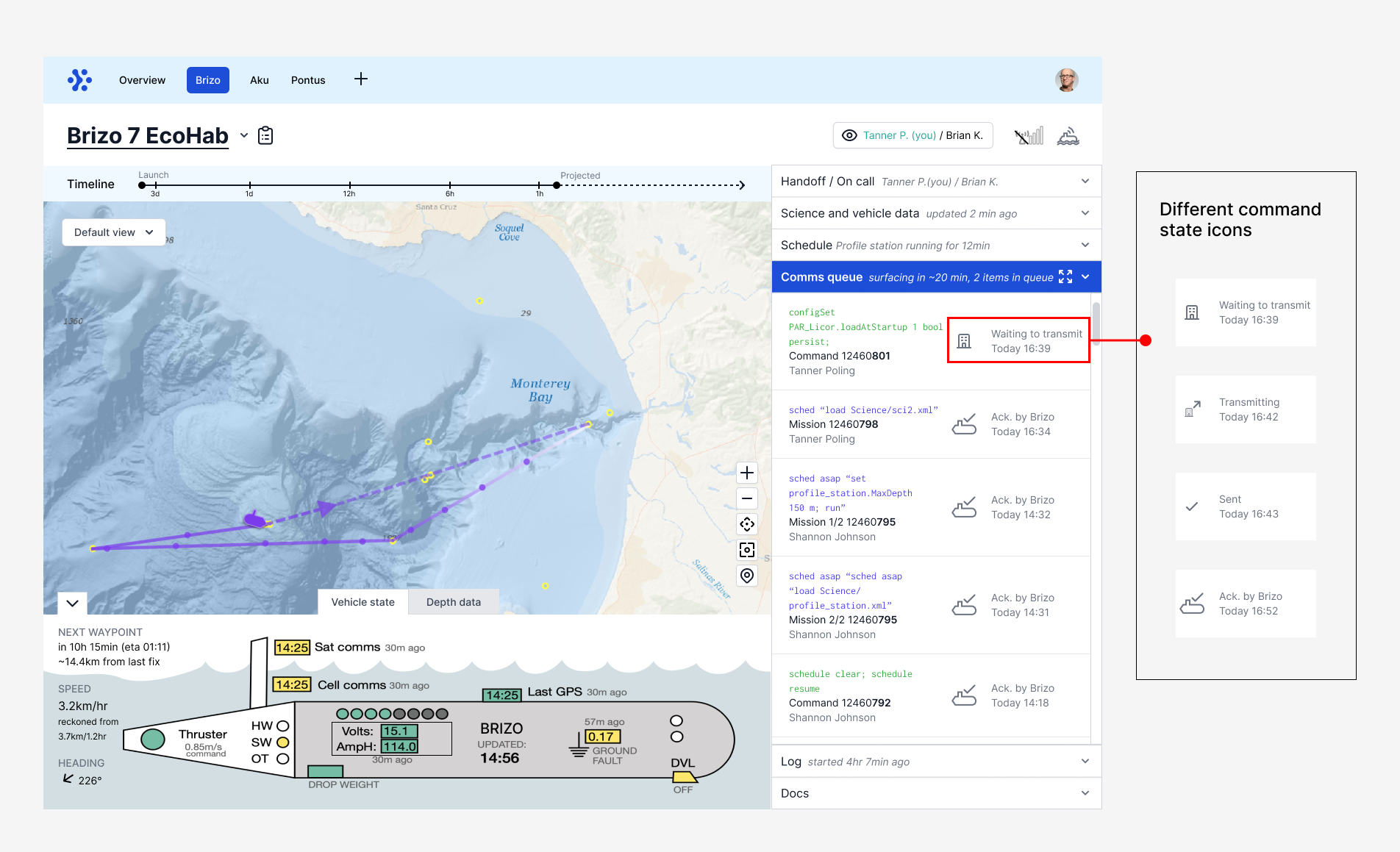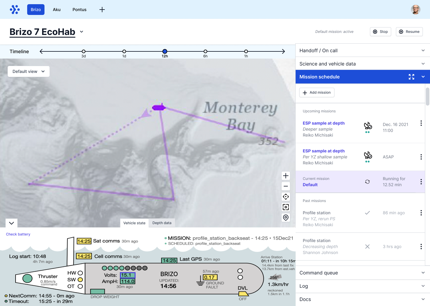 The main goal of the dashboard is to set up missions for the LRAUV to collect data. These missions can last for days and the vehicles need to be monitored for troubleshooting or new missions by the on-call person. During watch handoffs, the new on-call person needs a quick way to understand the vehicle’s past actions, current state, and next steps.