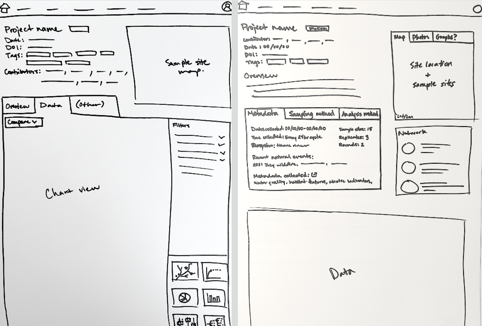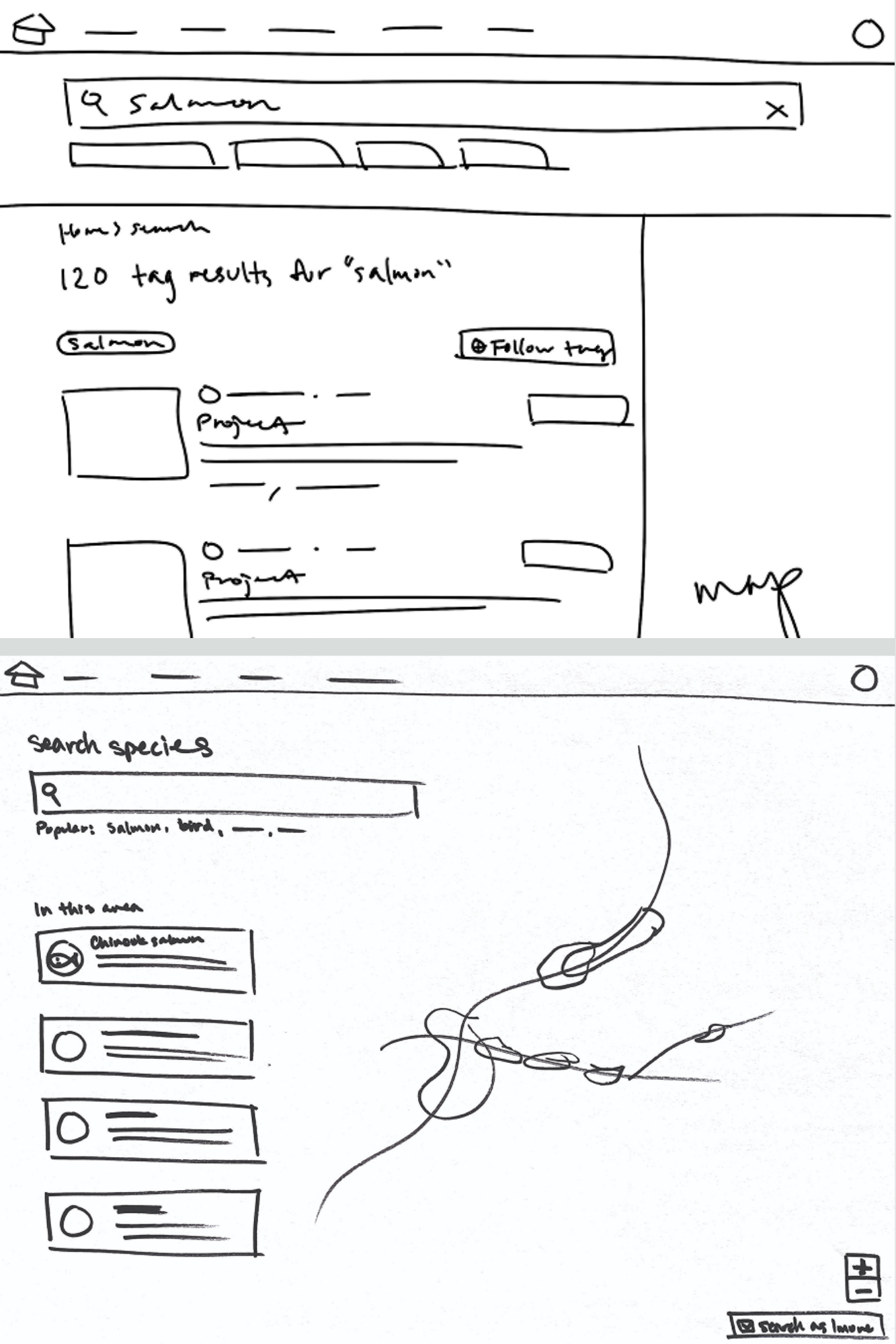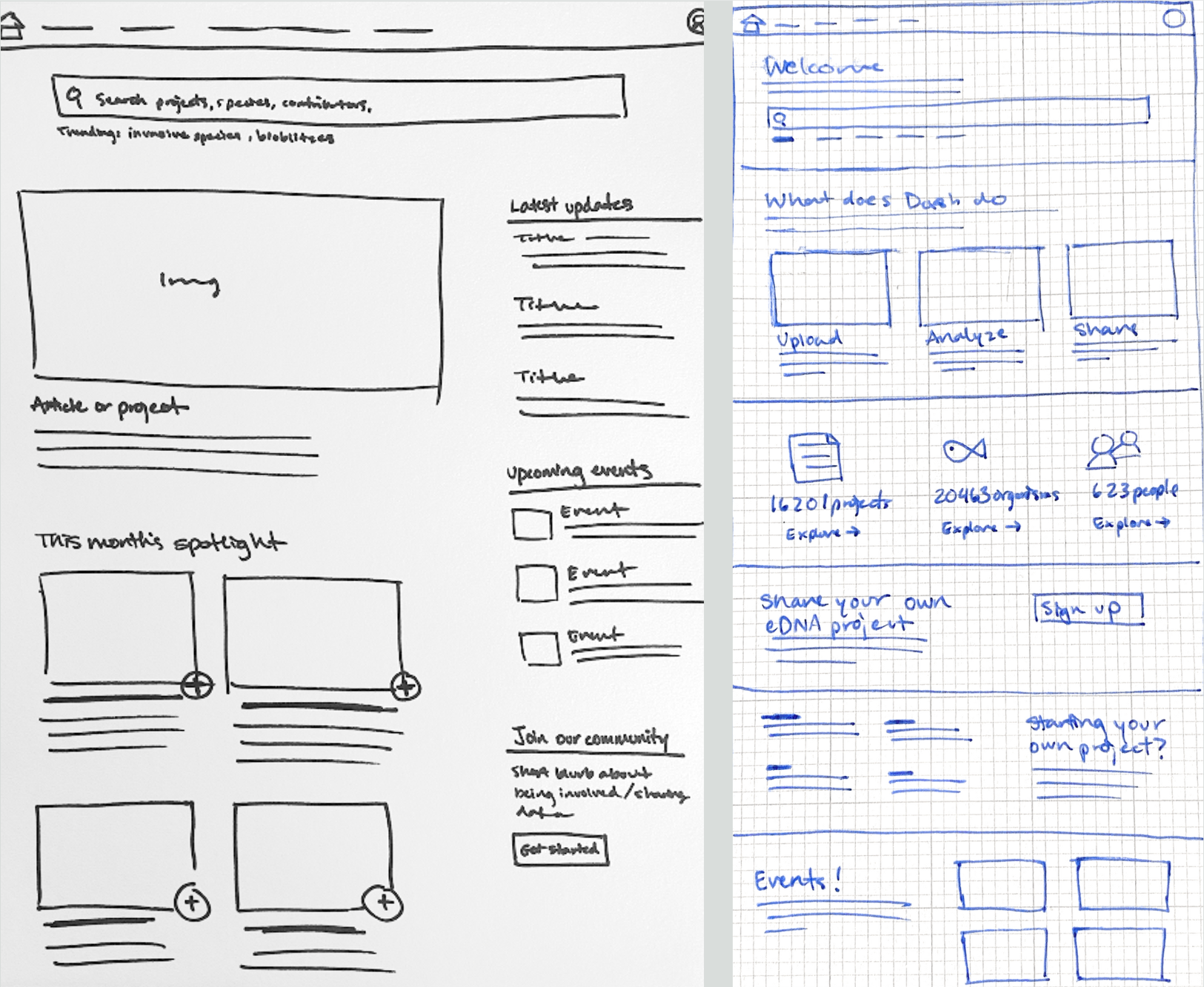 Working with our client, we envisioned a platform called eDNA Explorer where scientists, researchers, and managers could share their work, explore other eDNA projects, and get their own data analyzed. I explored multiple design directions through sketches for key pages, including project data and submission, species and project exploration, and community features.