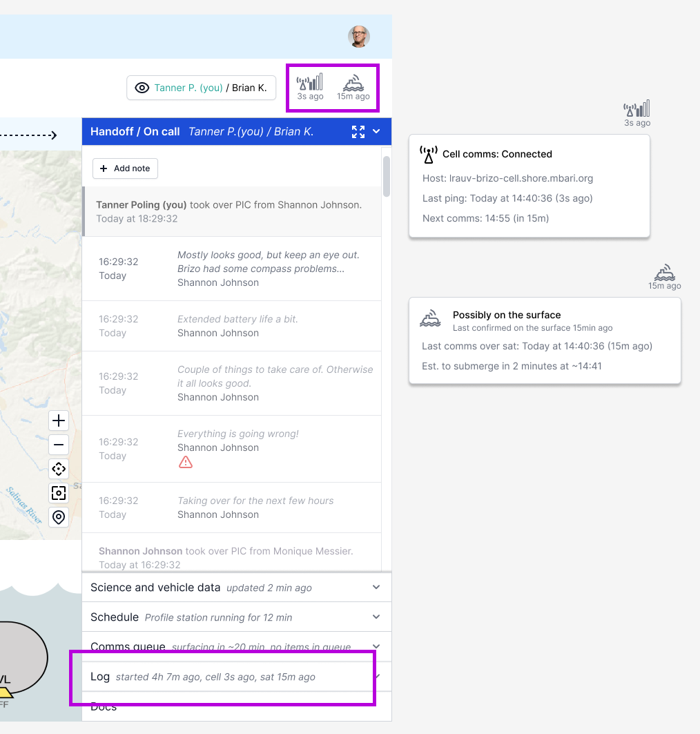 The main goal of the dashboard is to set up missions for the LRAUV to collect data. These missions can last for days and the vehicles need to be monitored for troubleshooting or assigning new missions by the on-call person. During watch handoffs, the new on-call person needs a quick way to understand the vehicle’s past actions, current state, and next steps.